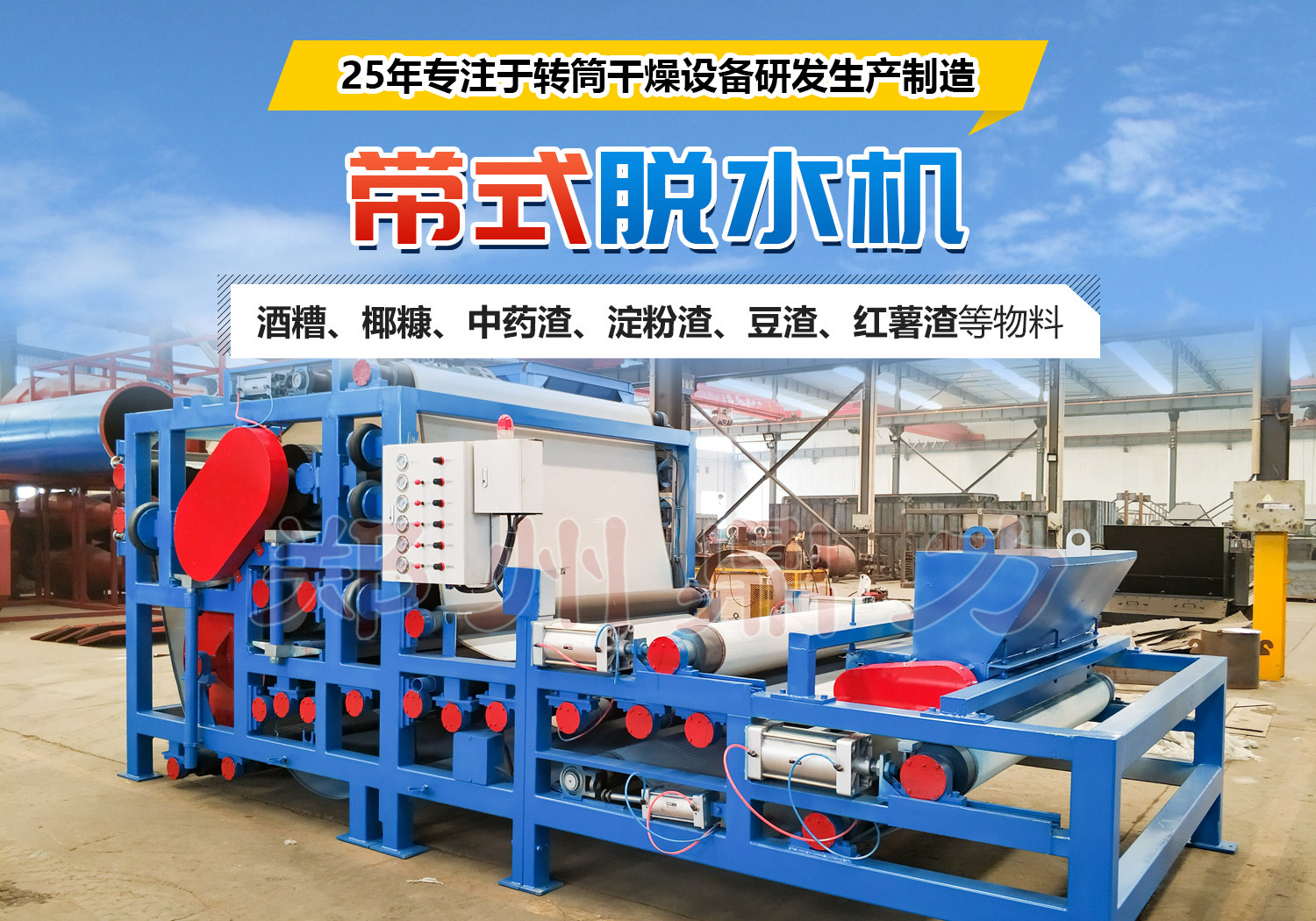 脫水機(jī)主要由:主機(jī)(脫水機(jī)本體)、空氣壓縮機(jī)、氣源處理器、電器控制箱、洗網(wǎng)水過(guò)濾器結(jié)構(gòu)組成。其中主機(jī)部分主要由機(jī)架、給料斗、濾網(wǎng)、張緊裝置、調(diào)偏裝置、驅(qū)動(dòng)機(jī)構(gòu)、刮刀卸料裝置、各種軸承座及輥筒、污水槽、洗網(wǎng)裝置等組成
